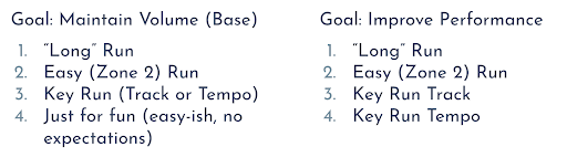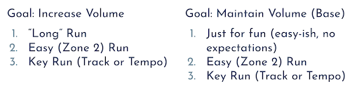 Once you move beyond two runs per week, we can start to work more intentionally with volume, performance, and overall balance. With three runs per week, I break training into two broad categories: increasing volume or performance, and maintaining volume.