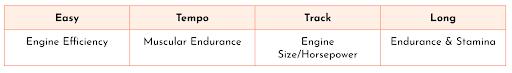 I like to use a car analogy to explain different types of runs. You are training both the engine and the chassis. I generally break runs into four categories: